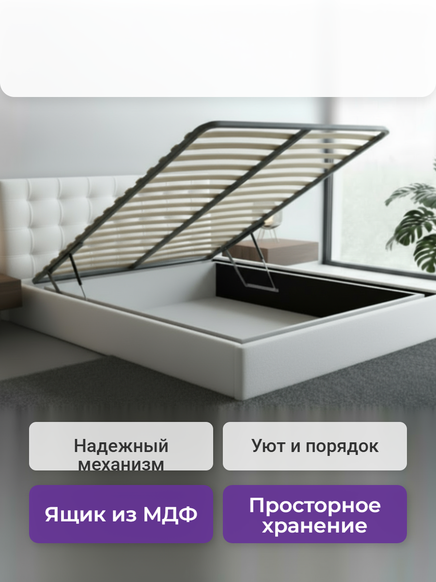 - Просторное спальное место с подъемным механизмом — идеально для хранения сезонных вещей или текстиля, экономит пространство в комнате.
